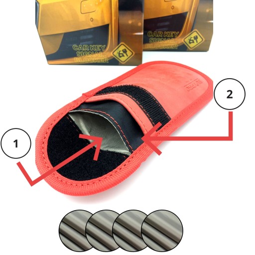 - Kieszeń nr 1 blokuje sygnał kluczyka co uniemożliwia zaczytanie sygnału przez złodziei - włóż kluczyk samochodowy do kieszeni oraz zamknij szczelnie pokrowiec