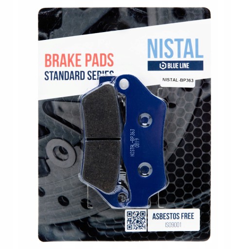 Klocki hamulcowe marki NISTAL to bezpieczny i trwały produkt posiadający doskonały stosunek jakości do ceny. Okładzina to organiczny materiał cierny wzbogacony dodatkami poprawiającymi hamowanie. Klocki z niebieskiej serii BLUE LINE dzięki zawartości 20% miedzi, zapewniają dobre odprowadzanie ciepła, nie szarpią i nie piszczą podczas hamowania. Zapewniają łagodne zużywanie się tarczy. Sprawdzą się również w cięższych motocyklach do rekreacyjnej jazdy. Wytwarzane zgodnie z certyfikatami: ISO 9001:2008, ISO 14001:2004, OHSAS 18001:2007.