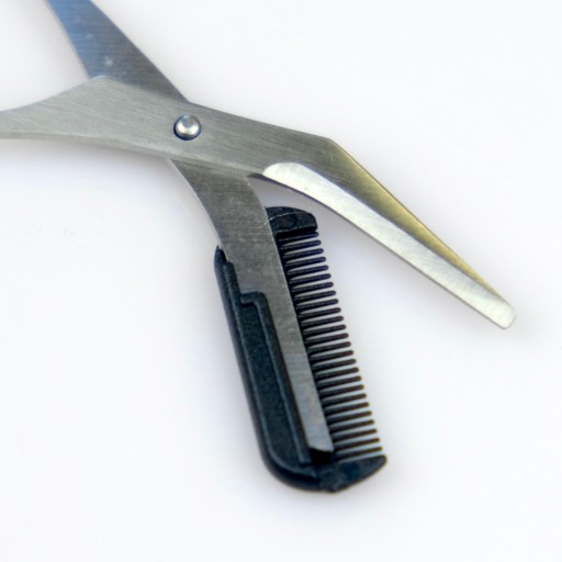 Specjalistyczne precyzyjne nożyczki przeznaczone do przycinania i stylizacji brwi zaopatrzone w grzebyk ułatwiający ułożenie brwi przed ich przycięciem.
