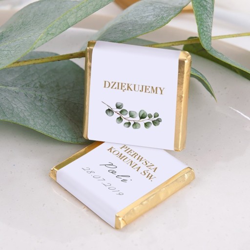Czekoladki z podziękowaniem to wspaniały pomysł na upominek dla gości. Elegancki motyw eukaliptusa świetnie się sprawdzi zarówno na Komunię, jak i Chrzest. Dzięki czekoladkom we wspaniały sposób podziękujecie gościom za przybycie.