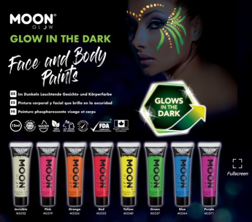 Farby Moon Glow Glow In The Dark Face &Body Panit są to farby, które świecą w świetle UV i dodatkowo dają efekt świetlny w ciemności. Można nimi malować na ciele i na twarzy (nie należy malować w okolicach oczu i ust). Farby Glow In The Dark najlepiej ładują się w świetle UV ale również w świetle dziennym, żeby świecić w ciemności. Farbki bezbarwnej najlepiej używać jako TOP COAT do wzmocnienia świecenia. Dla lepszego efektu należy nałożyć dwie warstwy farby. Farbki są zapakowane w tubki po 12ml każda. Świetne na imprezy urodzinowe i inne okazje do zabawy. Łatwo zmywają się woda z mydłem. Proszę wziąć pod uwagę, że jest to produkt kosmetyczny, gdzie krycie i wydajność podlegają indywidualnej ocenie klienta. Wszystkie produkty firmy Moon Glow posiadają certyfikaty kosmetyczne i są zgodne z normą EU1223/2009.