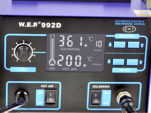 Stacja lutownicza 992D wyróżnia wysokimi parametrami pracy, wieloma funkcjami, pokazanymi na czytelnym wyświetlaczu LCD. Zaletą stacji jest pokazywanie mocy nadmuchu gorącego powietrza na wyświetlaczu (wskaźnik mocy nadmuchu), czego nie ma w innych stacjach.