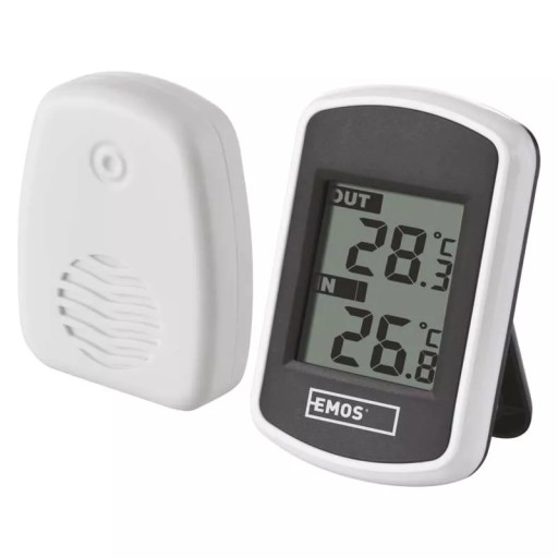 Termometr bezprzewodowy z wyświetlaniem temperatury wewnętrznej i zewnętrznej. Termometr ma czujnik bezprzewodowy o zasięgu do 100 m.