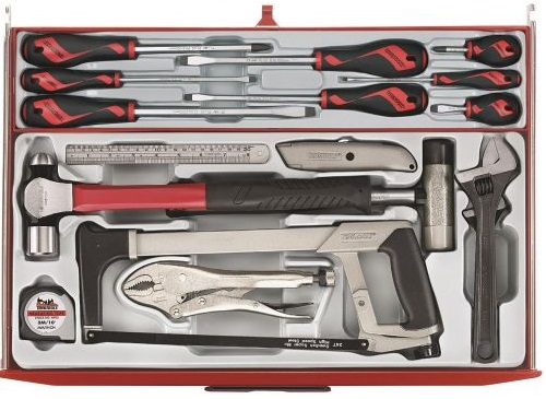 - zestaw 11 narzędzi ogólnoużytkowych: 4003 - klucz nastawny 28 mm, 4005 - klucz nastawny 38 mm, 401-10 - szczypce uniwersalne, 701 - piła ramkowa do brzeszczotów, 705 - piła uniwersalna (do cięcia drewna, metalu i tworzyw sztucznych), 710 - nóż uniwersalny, HMBP16 - młotek z noskiem kulistym, 16 uncji, HMSF - młotek nylonowo-gumowy 670 g, MD503 - wkrętak do opasek zaciskowych, ST200 - przymiar stalowy, MT03 - przymiar taśmowy