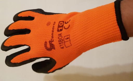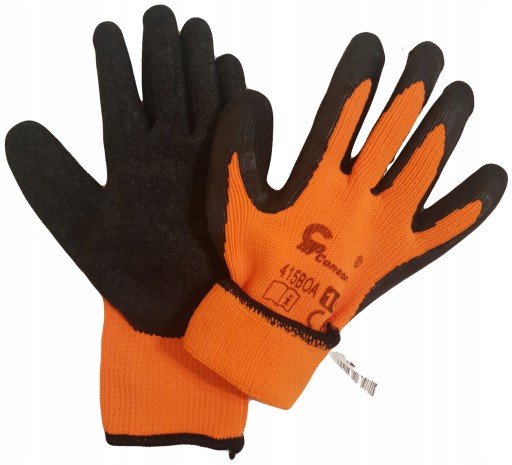 - Rękawice wykonane z ocieplanej dzianiny typu FROTTE poliestrowo bawełnianej w kolorze pomarańczowym, powlekanej w części chwytnej lateksem o szorstkowanej strukturze.