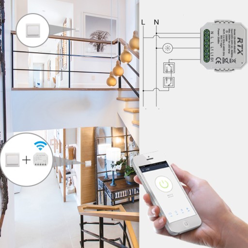 Moduł przekaźnika instaluje się w puszce pod tradycyjnym włącznikiem światła. Po podłączeniu zgodnym ze schematem będzie można sterować zapalaniem światła zdalnie z aplikacji, tradycyjnie włącznikiem lub w sposób zautomatyzowany według wcześniej zaprogramowanych scenariuszy.
