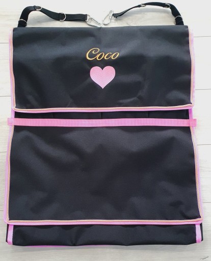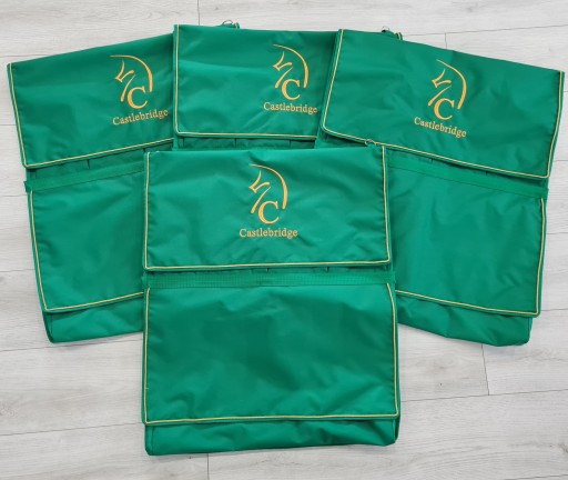 Na górnej klapie umieszczony jest haft z dowolnym napisem, np. imieniem jeźdźca, imieniem konia czy nazwą klubu.