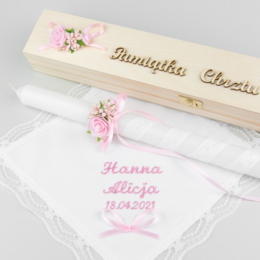 Proponujemy Wam śliczny, efektowny i bardzo dziewczęcy zestaw do chrztu, który zagości w pamięci zgromadzonych gości i rodziny. Szatkę i świecę po uroczystości będziecie mogły, Drogie Mamy, przechowywać w drewnianym pudełku, które jest stylizowane tak, aby stanowiło dopełnienie szatki i świecy. Pudełko do przechowywania idealnie zabezpieczy pamiątki chrztu, i sprawi, że będziecie wspólnie ze swoją pociechą mile wspominać te niezapomniane i wyjątkowe chwile. :)