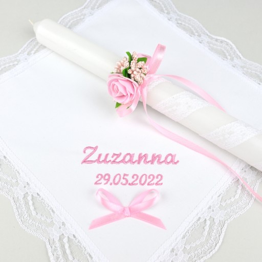 ŚWIECA - wykonana jest z białego wosku. Ozdabiamy ją ręcznie. Świeca owinięta jest tą samą koronką, co brzegi szatki. Różowo-zielona ozdoba świecy jest bardzo efektowna, skromna i delikatna. Idealnie wpasowuje się w nowoczesne trendy i obecną modę.