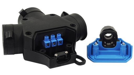 Trójnik posiada trzy gniazda z klapkami, co zapewnia mu szczelność IP44.