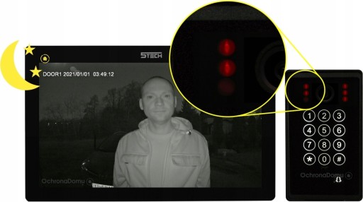 W trakcie rozmowy w nocy, urządzenie aktywuje diody doświetlające (po obu stronach obiektywu) osobę dzwoniącą. Dzięki temu mamy gwarancję dobrej widoczności nawet w całkowitych ciemnościach !
