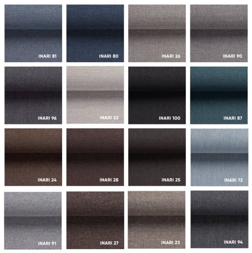 Materiał obiciowy INARI ze splotem imitującym naturalną, lnianą tkaninę. Nitki o różnych odcieniach sprawiają że materiał nie jest jednokolorowy, a to znacznie poprawia walory użytkowe mebla. Proste i mocne tkanie sprawia, że INARI to tkanina wytrzymała i odporna na wycieranie. Jest to idealny materiał do codziennego użytku. Posiada wysoką odporność na blaknięcie.