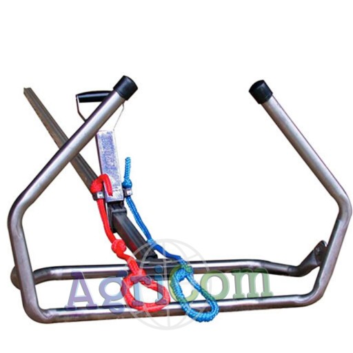 - Uchwyt obejmujący zad krowy uniemożliwia zsuwanie się wycielacza dzięki czemu po naciągnięciu linek porodowych wycielacz utrzymuje się samoczynnie na zadzie krowy, dając osobie asystującej możliwość zwolnienia obu rąk.