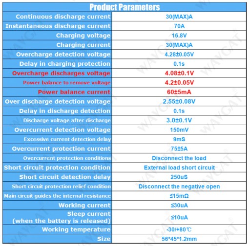 - Obsługuje akumulatory 4S typu: Li-ion, LiCoO2, LiMn2O4, Li (NiCoMn) O2, Lipo