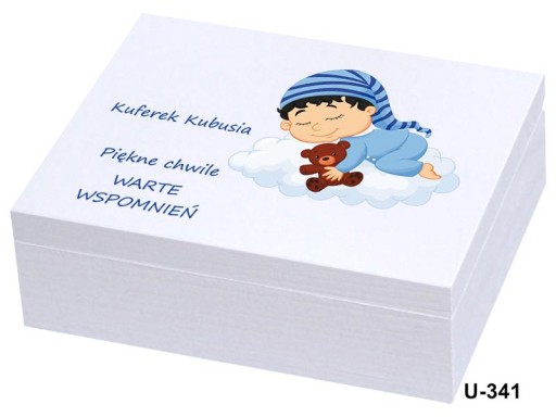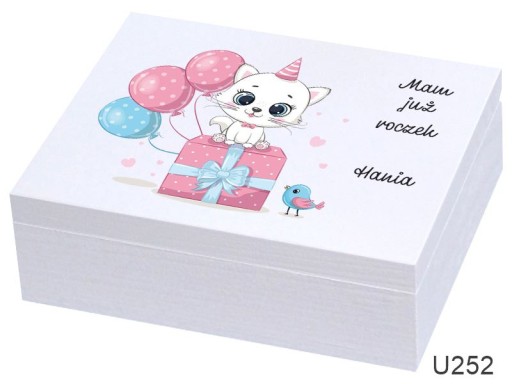 Drewniane pudełko z zewnątrz malowane na biało wieko z kolorowym nadrukiem bezpośrednio na pudełku , personalizacja IMIĘ