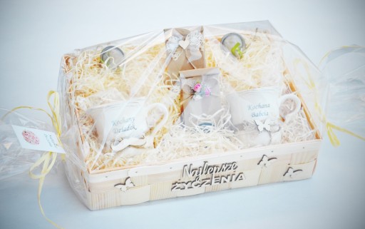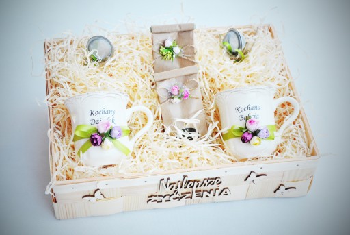 Piękny i praktyczny prezent na Dzień Babci i Dziadka - komplet porcelanowych kubków i wyśmienita herbata, sitka do zaparzania herbaty - całość pięknie ozdobiona i zapakowana w celofan.