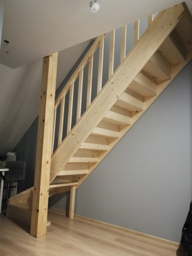 Schody są wykonane z lekkiego, jasnego drewna świerkowego, które można lakierować na dowolny kolor. Dzięki temu idealnie komponują się z każdym pomieszczeniem.