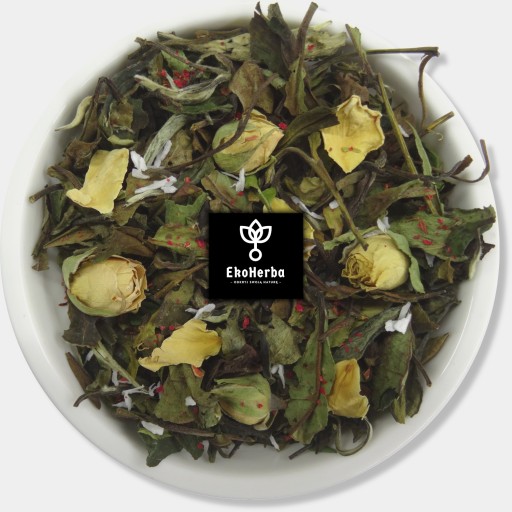 Biała róża - niewinność i czystość to symbole białej róży, czerpiąc z nich inspiracje dodaliśmy od siebie kwiat granatu i delikatne wiórki kokosowe, podkreślając tym samym kwintesencję białej herbaty i obłędny aromat dzikiej róży.