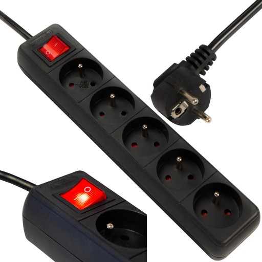 Przedłużacz sieciowy BLOW w kolorze czarnym z pięcioma gniazdami przeznaczony do użytku domowego. Przedłużacz pozwala podłączyć urządzenia, które są oddalone od gniazda elektrycznego. Produkt z jednej strony posiada 5 gniazd które są obrócone pod kątem, a z drugiej pojedynczy kątowy wtyk sieciowy.