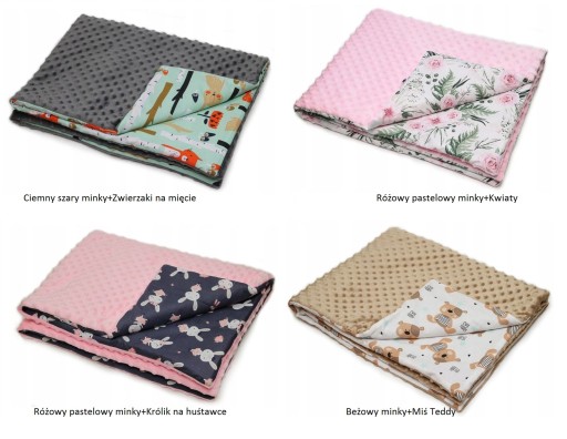 Kolorystykę kocyka można wybrać z wzorów widocznych na dole strony. ( W "wiadomości do sprzedającego" prosze podac wzór bawełny i kolor minky)