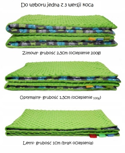 Uszyte są z mięciutkiego, niezwykle przyjemnego w dotyku polaru minky oraz tkaniny dziecięcej I gatunku (100% bawełna) Materiały posiadają wszystkie niezbędne certyfikaty dopuszczające je do kontaktu z dziećmi m.in. Oko-TEX Standard 100. Do wyboru jedna z 3 wersji grubości kocyka ( domyślnie wysyłany jest koc z wersji optymalnej)