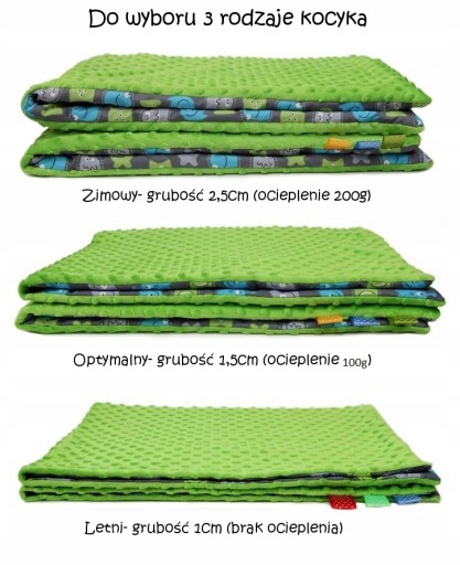 Uszyte są z mięciutkiego, niezwykle przyjemnego w dotyku polaru minky oraz tkaniny dziecięcej I gatunku (100% bawełna) Materiały posiadają wszystkie niezbędne certyfikaty dopuszczające je do kontaktu z dziećmi m.in. Oko-TEX Standard 100. Do wyboru 3 wersje grubości kocyka ( domyślnie wysyłany jest koc z wersji optymalnej)