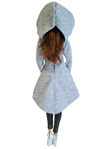 Przedmiotem sprzedaży jest tuniko-sukienka z kapturem. Uszyta z melanżowej dzianiny. Kaptur ma z tyłu rozcięcie dzięki czemu możemy przełożyć włosy lalki. Zapięcie na delikatny rzep.