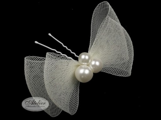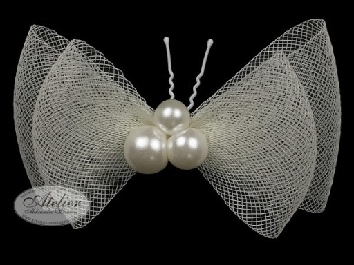 Metalowa szpilka ozdobiona kokardą z crin i dużymi perłami. Jest to produkt szyty ręcznie - nieklejony.
