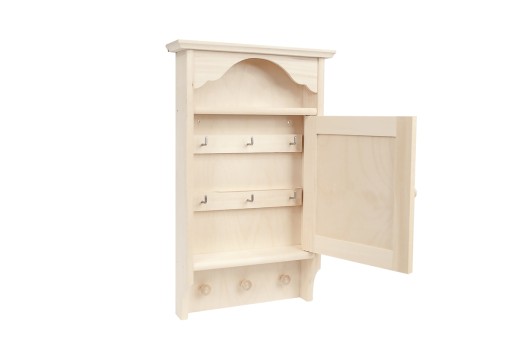 Szafka na klucze z zamykanymi drzwiczkami. Wewnątrz 6 haczyków na klucze. Poniżej drzwiczek dodatkowe 3 drewniane kołki.