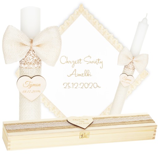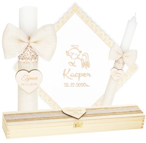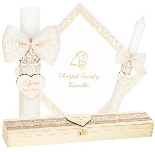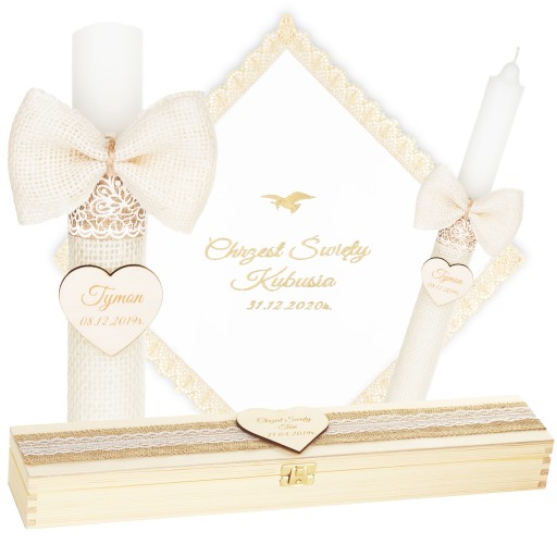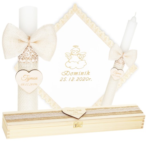 - grawer techniką laserową - do świecy oraz pudełka przytwierdzona jest zawieszka , na której grawerujemy imię dziecka oraz datę uroczystości. Do grawerowania stosujemy najnowsze urządzenia światowego lidera.