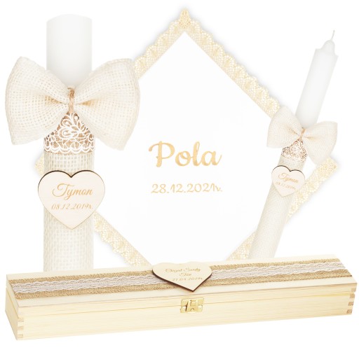 ŚWIECA + SZATKA +PUDEŁKO Z TAŚMĄ JUTOWĄ I SERCEM
