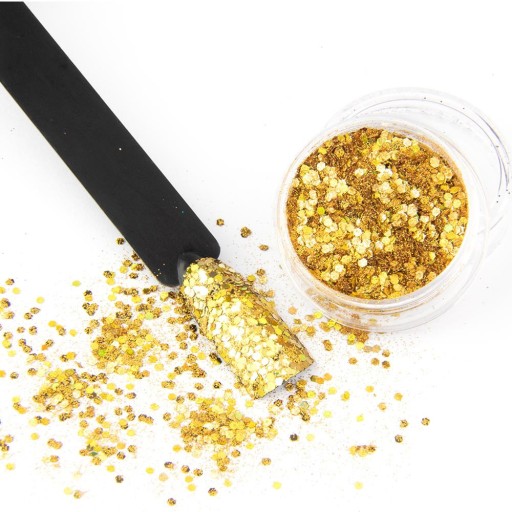 Nałóż pyłek w całą powierzchnię pomalowanego wcześnie, ale nie utwardzonego lakierem hybrydowym paznokcia, utwardź w lampie i ciesz się błyszczącym efektem w brokatowej odsłonie. Dyskotekowy manicure AFTER PARTY to nieprzemijalny HIT w świecie stylizacji paznokci!