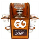 W skład wchodzi karafka szklana plus 6 kieliszków szklanych lekko przyklejonych do całości.
