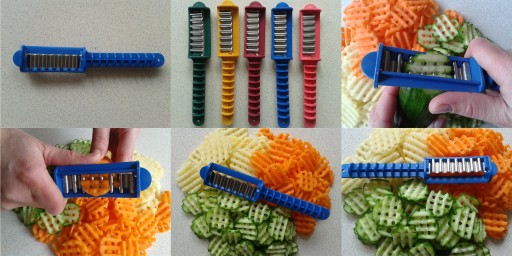 Za pomocą tego nożyka warzywa i owoce można pokroić w ozdobne talarki (kratki) , co widać na zdjęciach.