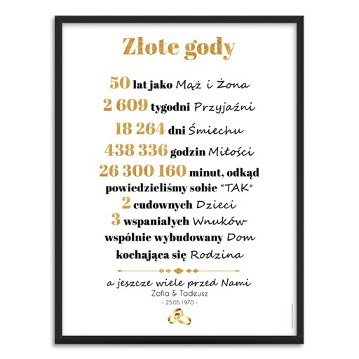 Plakat na ZŁOTE GODY, może być przygotowany także na na dowolną inną ROCZNICĘ ŚLUBU.