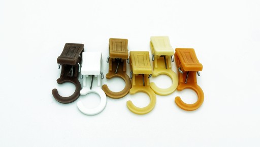 Wykonane z plastiku (polipropylen) o bardzo dużej wytrzymałości i odporności. Mocna sprężynka powoduje że żabka posiada mocny ścisk na ząbkach utrzymując firany i zasłony. Pasują na kółka plastikowe jak i drewniane zakładane na drążki karnisza o średnicy 16mm, 19mm i 25 mm.
