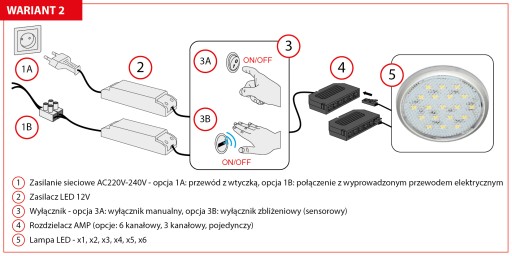Pierwszy wariant przewiduje podłączenie lampy / kliku lamp do sieci za pomocą przewodu z wtyczką lub przewodu wyprowadzonego ze ściany. Następnie instalowany jest wyłącznik działający pod napięciem 230V. Potem stosujemy elektroniczny zasilacz LED, do którego podpinamy rozdzielacz a do niego lampy.