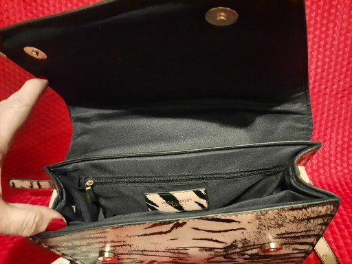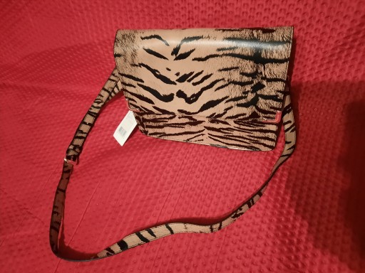 Torebka damska beżowa czarna zebra, usztywniona, z materiału poliester, ozdobiona złotą oprawą zamknięcia na magnes, 1komorowa, w środku 1 kieszeń na zamek i 2 bez zamka , na ramię pasek regulowany. Wymiary: 24x9x20cm, bardzo ładna, oryginalna!