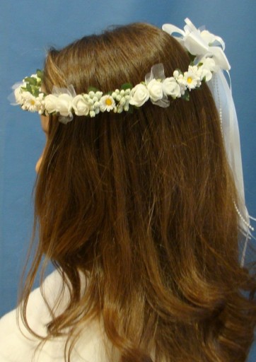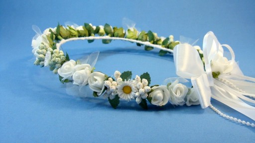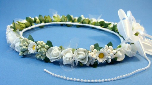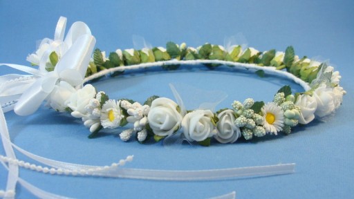 Wianek spleciony jest z 2 rodzajów małych białych różyczek piankowych, z których jedne mają szyfonowy okółek , stokrotek , białych i zielonych szyszeczek.