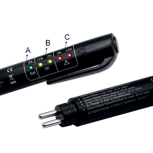 Tester płynu hamulcowego to urządzenie, dokonuje pomiaru stężenia procentowego wody w płynie hamulcowym. Płyn hamulcowy nie powinien zawierać więcej niż 1,5% wody, warunkowo dopuszczalna jest zawartość wody do ok 3%. Powyżej tej wartości płyn hamulcowy należy niezwłocznie wymienić.