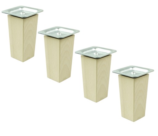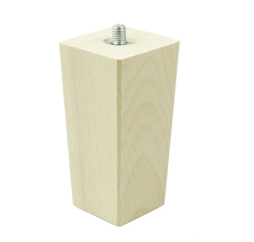 Noga bukowa - rozmiar 50 x 50 mm na górze, 40 x 40 mm na dole, kwadrat stożek 10 cm wysokości surowa. Wraz z nóżką otrzymują Państwo blachę montażową, która ułatwia montaż w meblu. Noga posiada wkręconą mufę M8 x 24 mm, do której wkręcamy szpilkę M8 x 30 mm oraz blachę montażową - znajdują się w zestawie. Do montażu blachy należy zastosować wkręty o rozmiarze 3,5 lub 4,0 do drewna - dostępne w naszej ofercie. Nóżkę można wg własnych potrzeb pomalować lakierem bezbarwnym lub wybarwić na dowolny kolor bejcą lub lakierem.
