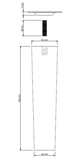Noga bukowa - rozmiar 50 x 50 mm na górze, 40 x 40 mm na dole, kwadrat stożek 20 cm wysokości surowa. Wraz z nóżką otrzymują Państwo blachę montażową, która ułatwia montaż w meblu. Noga posiada wkręconą mufę M8 x 24 mm, do której wkręcamy szpilkę M8 x 30 mm oraz blachę montażową - znajdują się w zestawie. Do montażu blachy należy zastosować wkręty o rozmiarze 3,5 lub 4,0 do drewna - dostępne w naszej ofercie. Nóżkę można wg własnych potrzeb pomalować lakierem bezbarwnym lub wybarwić na dowolny kolor bejcą lub lakierem.