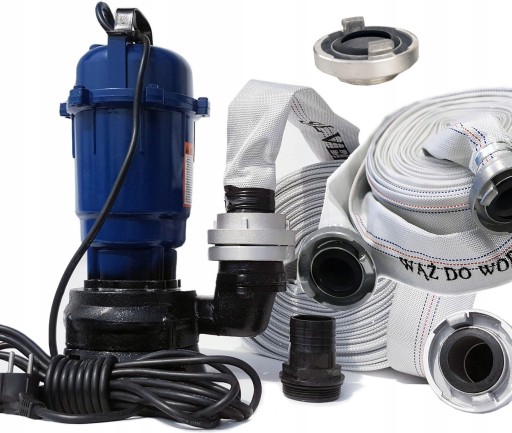 W zestawie w raz z pompą dwie złączki jedna z montażem typu FastFix do węża strażackiego druga do węży 2" montowanego opaską metalową zaciskową. Oraz dwa węże strażackie o łącznej długości 60 metrów