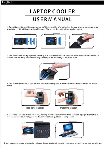 KOMPAKTOWY - małe rozmiary oraz miejsce podłączenia urządzenia powodują, że nie będzie przeszkadzało podczas pracy lub gry na laptopie. Wystarczy podpiąć go za pomocą kabla oraz umieścić odpowiednią gumową końcówkę w miejscu chłodzenia. Możemy użyć go zarówno w momencie w którym laptop, notebook się przegrzał lub użyć mniejszej prędkości aby zapobiec temu procesowi.