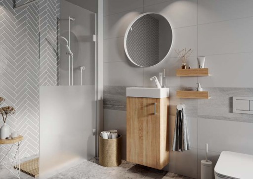 Szafka z umywalką OIA. Szafka z płyty korpusowej 16mm, w kolorze dąb sonoma lub biały groszek mat.