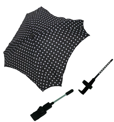 Parasolka posiada regulowany uchwyt oraz zginany przegub dzięki czemu pasuje do każdego wózka