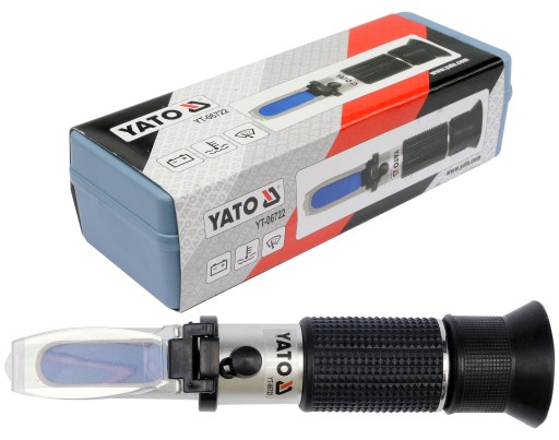 Refraktometr Yato jest profesjonalnym urządzeniem do pomiarów płynów eksploatacyjnych samochodów osobowych, ciężarowych i autobusów. Przeznaczony jest do określania temperatury zamarzania płynu do spryskiwaczy, płynu chłodzącego glikolu proplenowego i glikolu etylowego. Podaje również zakres gęstości elektrolitu.