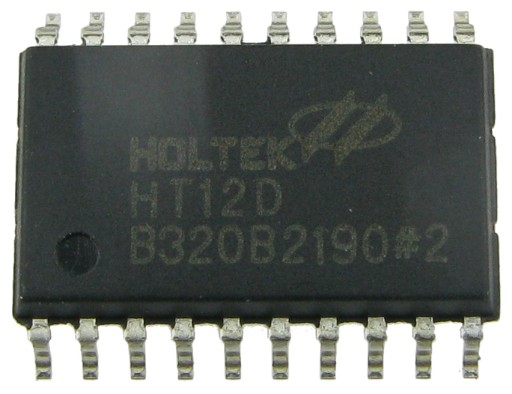 Układ scalony HT12D. Dekoder wykorzystywany w pilotach zdalnego sterowania. Obudowa: SMD, SO20. Zasilanie: 2,4-12VDC.