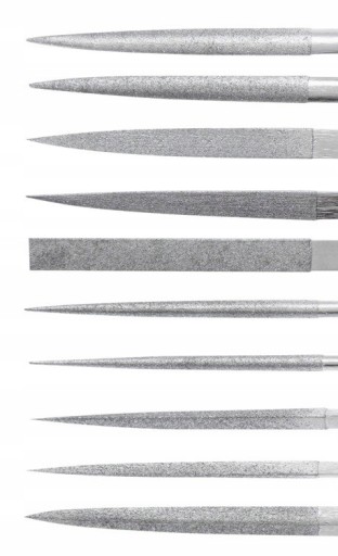Pilniki iglaki do precyzyjnych prac wykończeniowych w szkle, ceramice, drewnie, metalach. 10 różnorodnych kształtów stalowych grotów. Zastosowanie w jubilerstwie, zegarmistrzostwie, grawerstwie.