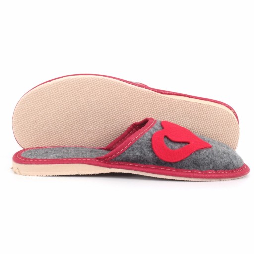 Zewnętrzna warstwa wykonana jest z tkaniny oddychającej typu filc kolorze szarym z czerwoną ozdobą typu serce.
